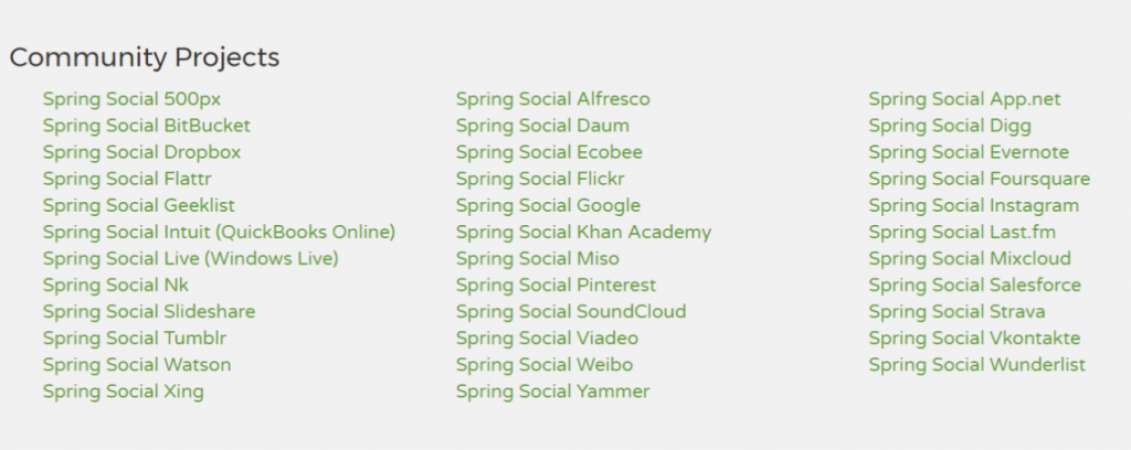 Należy zauważyć, że Spring Social to nie tylko Facebook czy Twitter. Możemy wykorzystać go również do połączeń z wieloma innymi usługami: